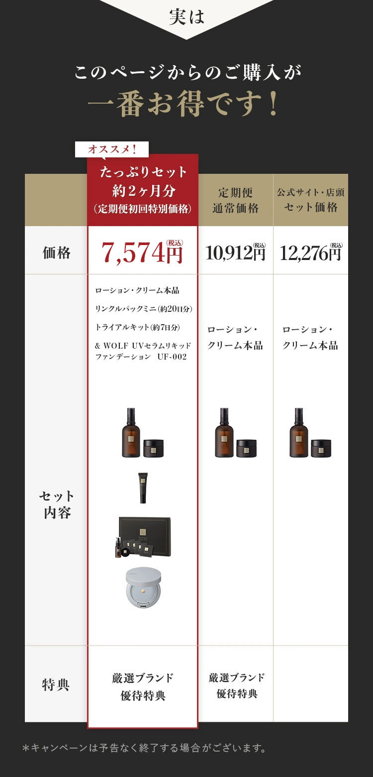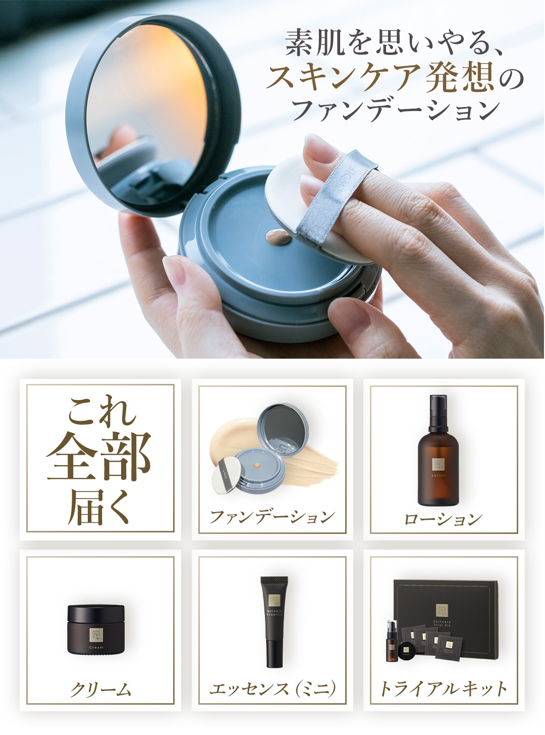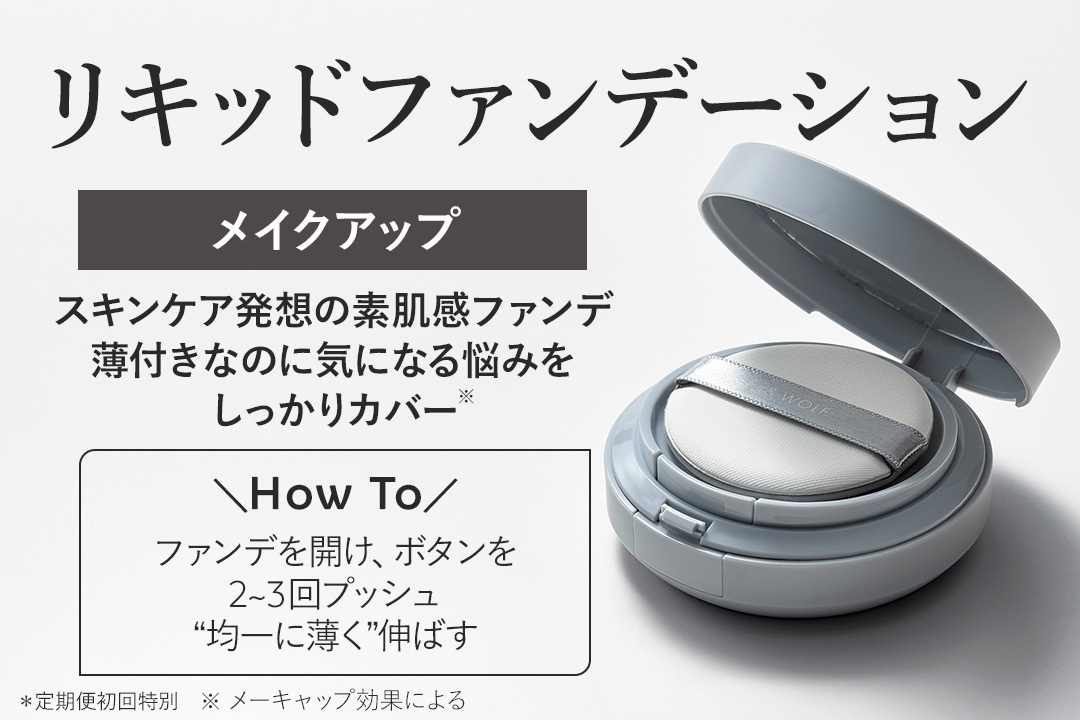 現在実施中のキャンペーンではリキッドファンデーションの本品と本格エイジングケアがセットに!※ 年齢に応じた潤いを与えるスキンケア