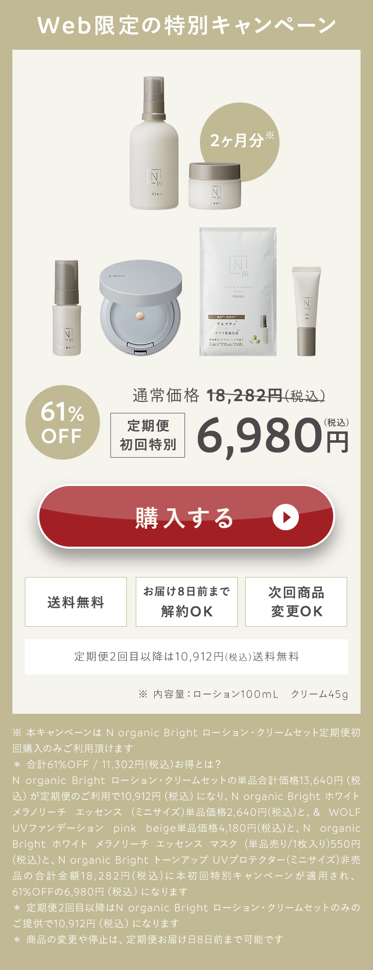 N organic Brightローション・クリームセット【定期便初回セット】Brightエッセンス(ミニサイズ)・& WOLF UVファンデーション(UF-001pink beige)・Brightエッセンスマスク1枚・BrightUVプロテクター(ミニサイズ)の5点セット