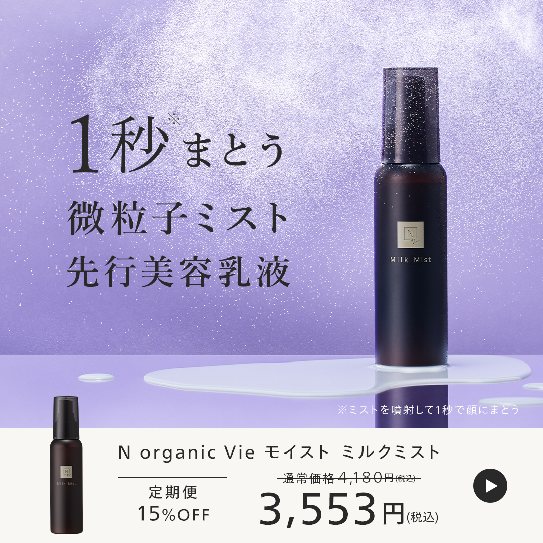 N organic Vie モイスト ミルクミストは、ブースターとしても、日中の乾燥ケアとしても使える多機能ミスト化粧水です。微粒子のミルクミストが肌全体にふんわり広がり、乾燥でゴワつきやすい肌にうるおいを届けます。