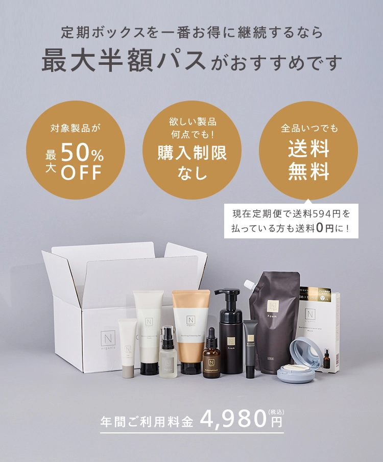 最大半額パス適用商品一覧はこちらよりご確認いただけます。最大半額パス適用商品以外の商品は、通常価格にて定期便商品に追加が可能です。詳しくは、最大半額パス入会後に商品追加ページをご確認ください。